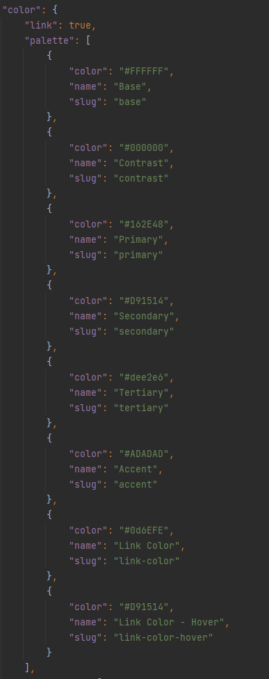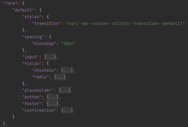 Other than maybe changing the default typography line-height, you won’t typically have to touch most of these additional style settings, but these help to ensure that various WordPress elements/blocks use the styles we’ve defined throughout theme.json.